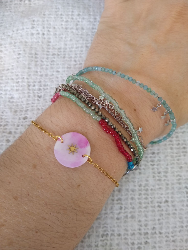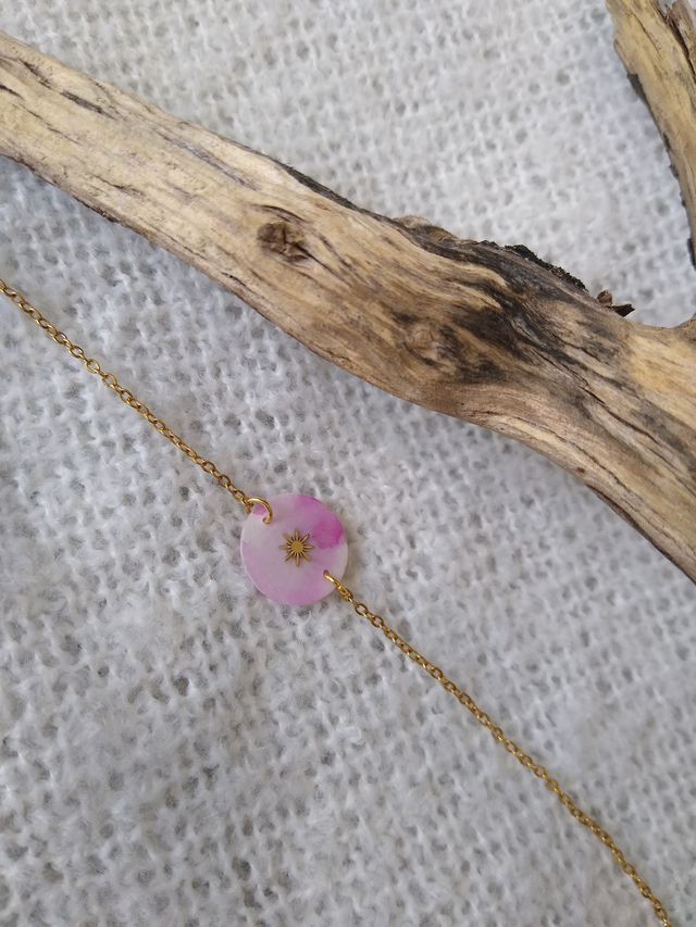 Issu d'un mariage entre l'aquarelle et l'incrustation d'un petit soleil au centre du cercle fushia, ce bracelet mesure 18 cm de long + 3 cm de réglage.