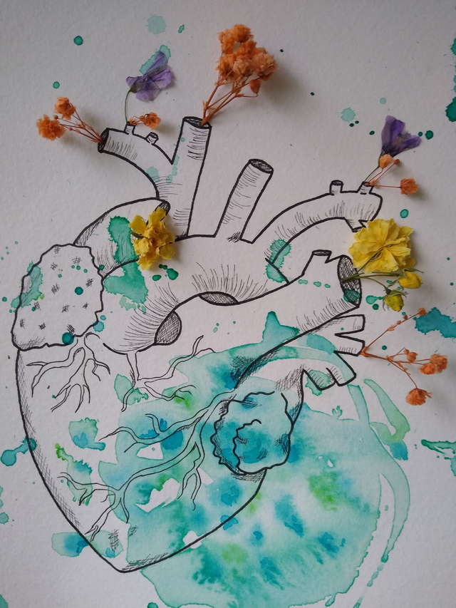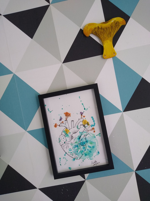 Dans cette aquarelle originale, je joue avec les pigments et l'eau... Mais aussi avec les fleurs séchées de mon jardin punk.