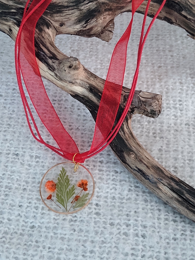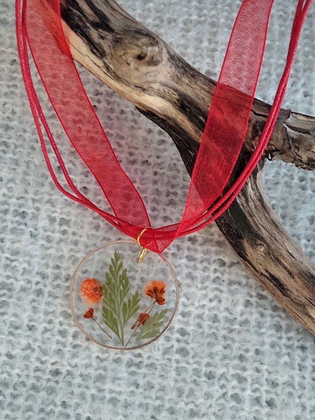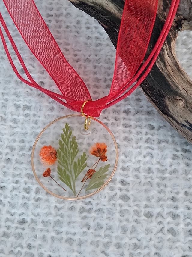 Fleurs et feuilles séchées et résine, sur lien en ruban.