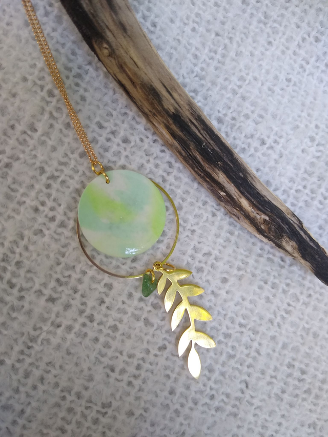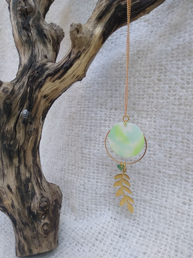 Ce sautoir allie parfaitement la couleur et l'élégance. Avec ce vert d'eau, sa perle de jade et son feuillage doré, il est à la fois poétique et apaisant...