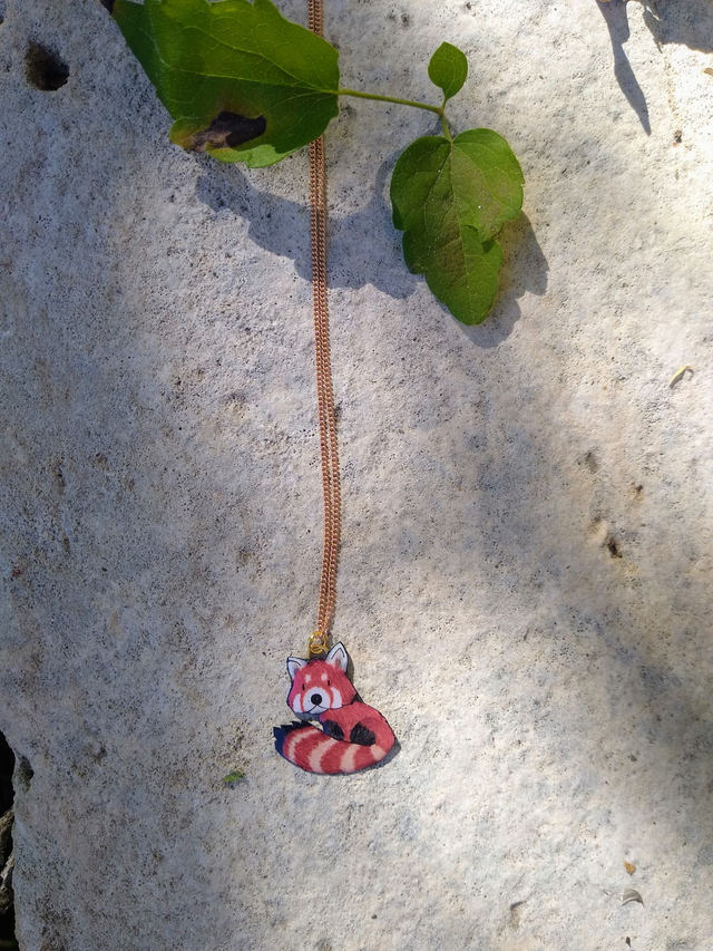 Voici un petit panda roux tout en mignonitude monté sur une chaîne longue de couleur or rose...