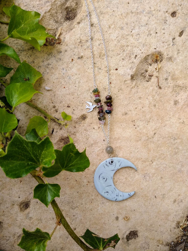 La lune est en céramique et l'hirondelle en acier inoxydable.
