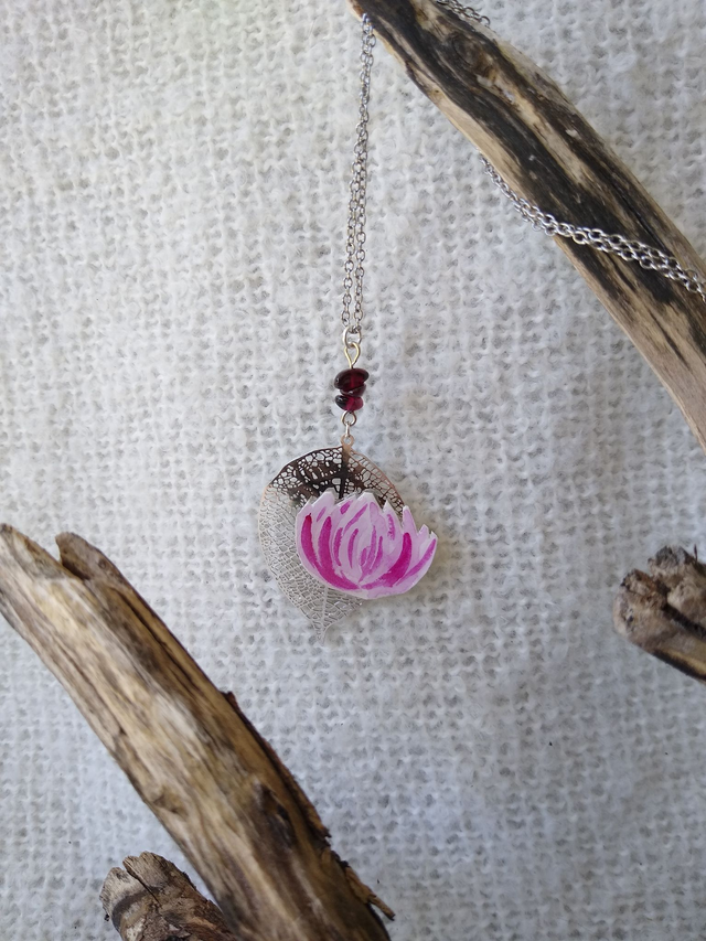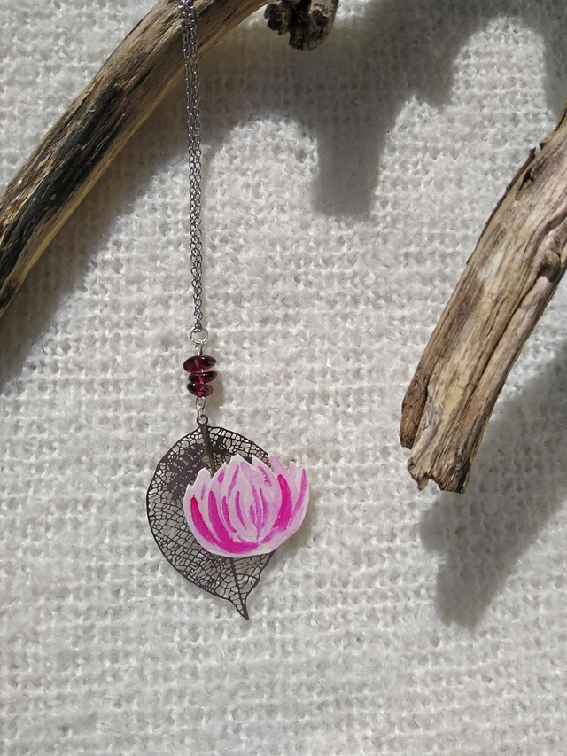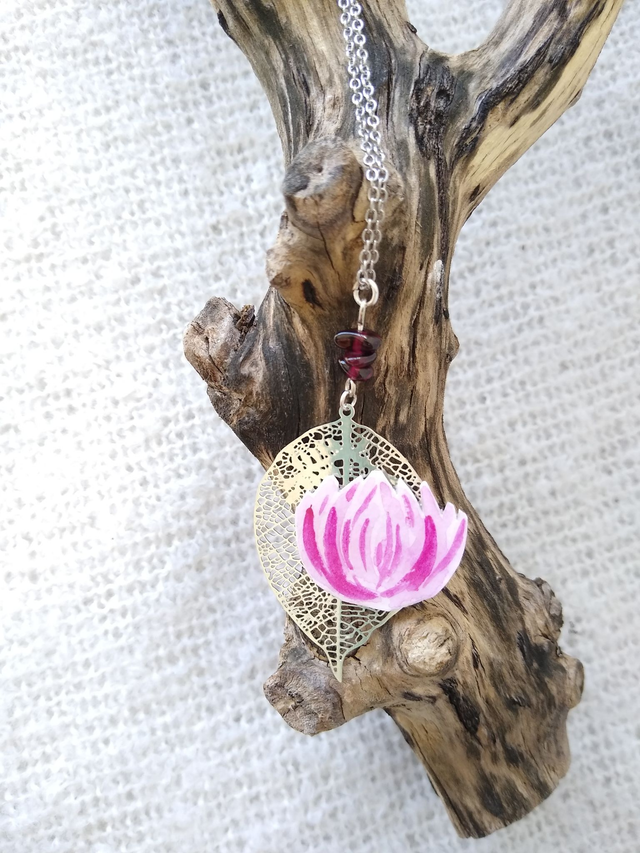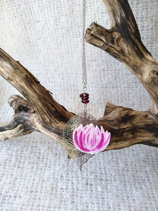 Ce collier court présente une fleur aquarellée, surmontée de ses 3 grenats. Il est en acier inoxydable argenté, pour un effet sobre, mais féérique ! Le grenat est connu pour apporter la joie, énergie vitale, force et confiance en soi !