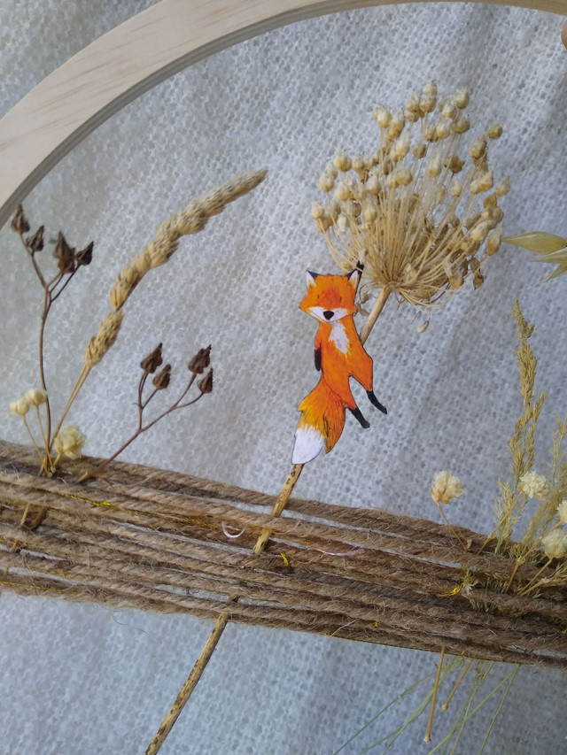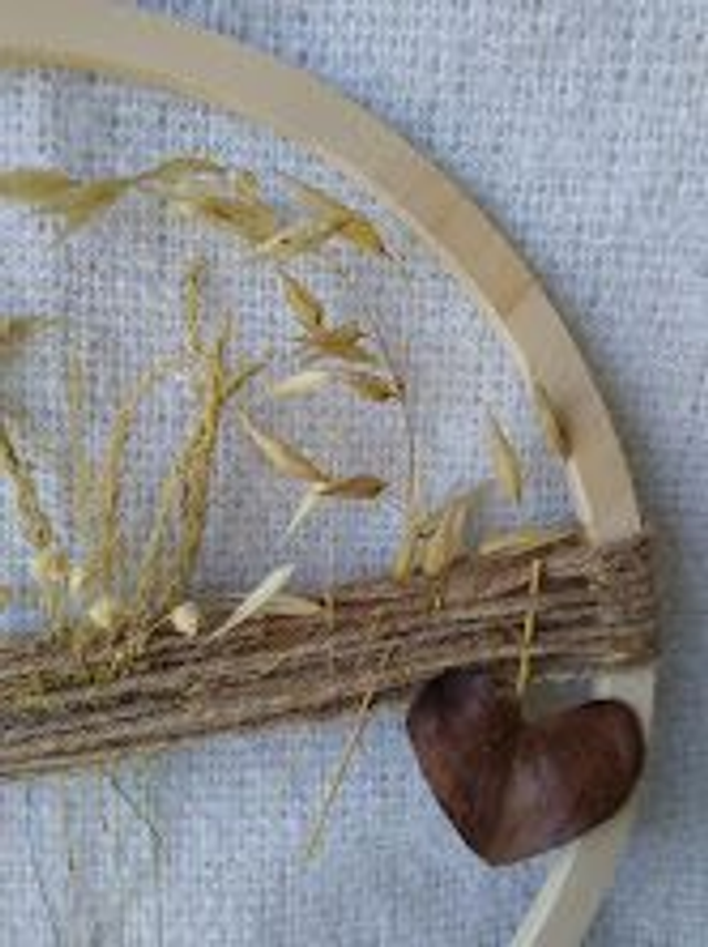 Fleurs séchées, papier, bois, corde en chanvre.