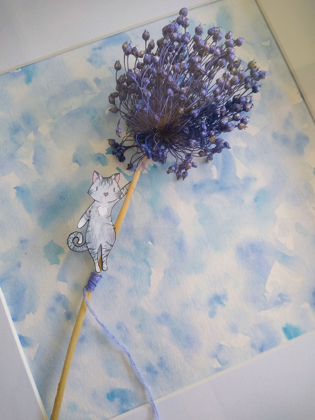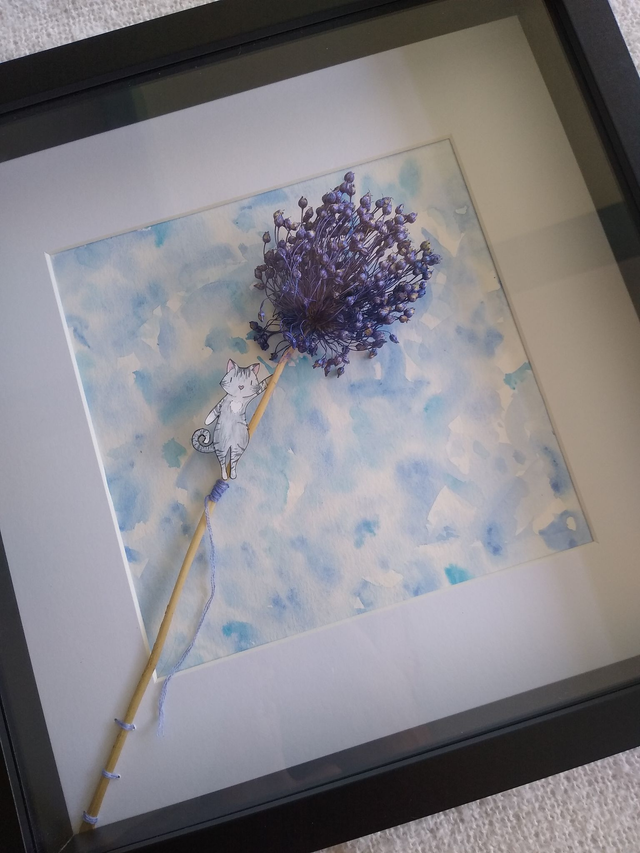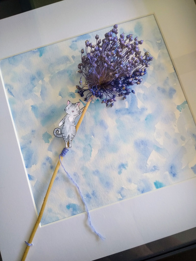 Aquarelle, fleur séchée, coton, collage.
