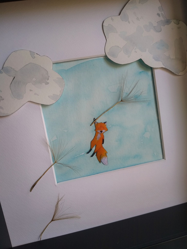 Voici un tableau unique et poétique qui vous propose de partir pour un petit tour dans les airs en pissenlit, aux côtés de ce renard aussi doux qu'aventurier !